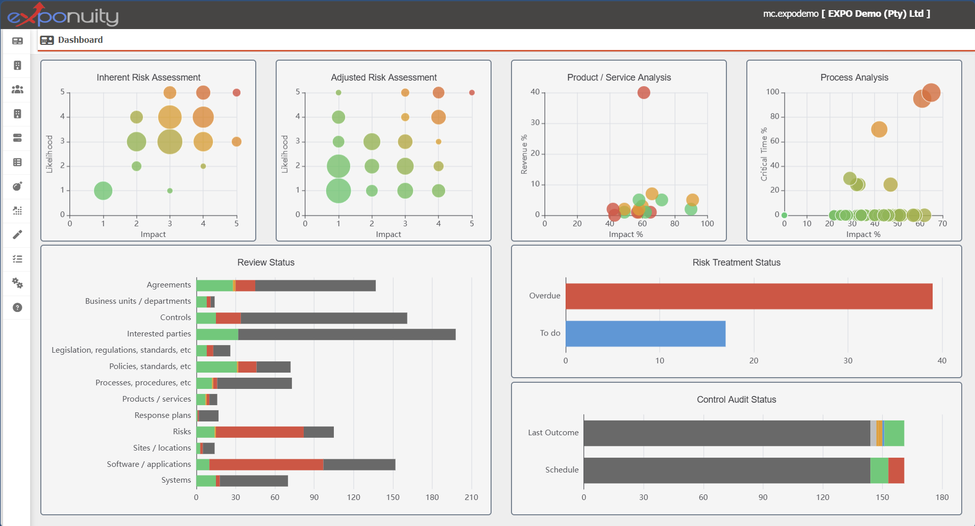 Exponuity is a comprehensive solution specifically designed to transform your compliance burden into a strategic advantage. It consolidates and relates information to provide insights on your compliance, risks and resiliency.